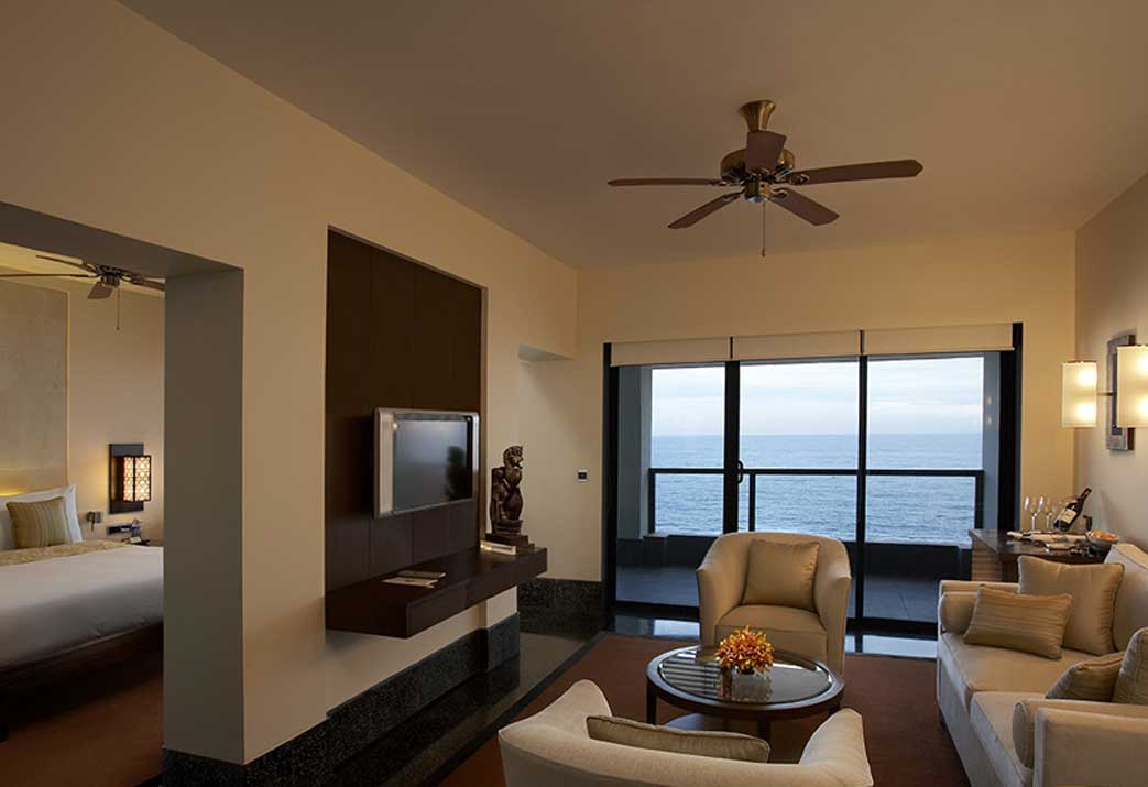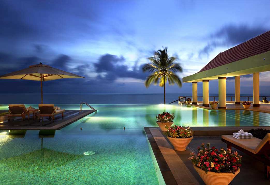 The Leela Kovalam in Kerala is built on a cliff-top and spreads over acres of lush greenery. It is cradled between wide sweeping beaches and has a panoramic view of the famous Kovalam coastline overlooking the Arabian Sea.